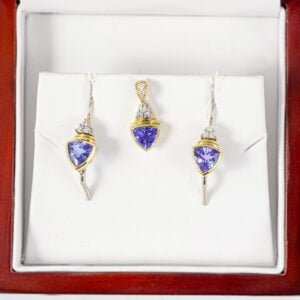 Kolekcja – kolczyki i przywieszka z Tanzanitami – każdy 1,2 ct., 18 karatowe białe złoto.