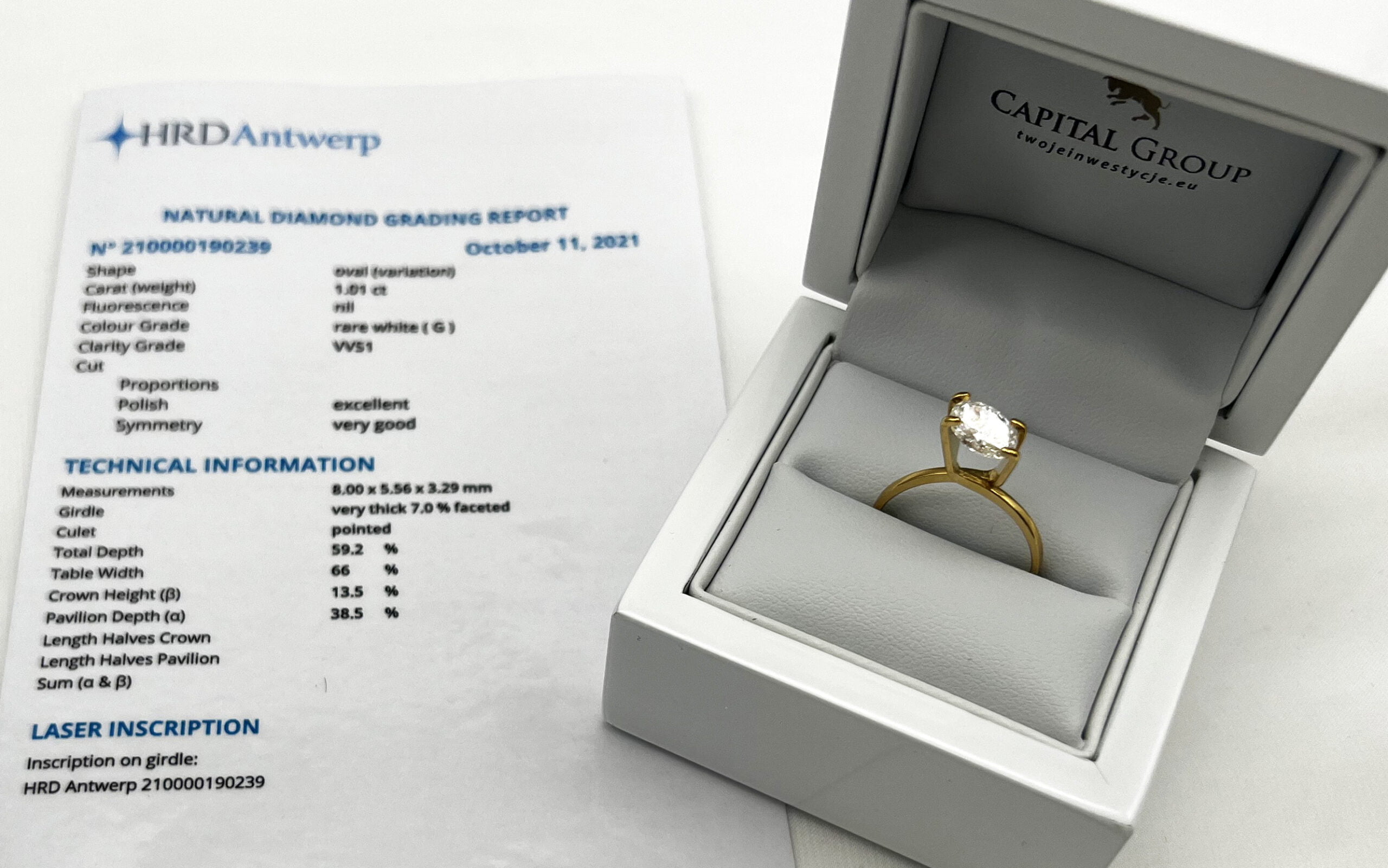 Natural Diamond, Carat 1,01, Oval, Rare white, VVS1, Excellent, HRD Antwerp
