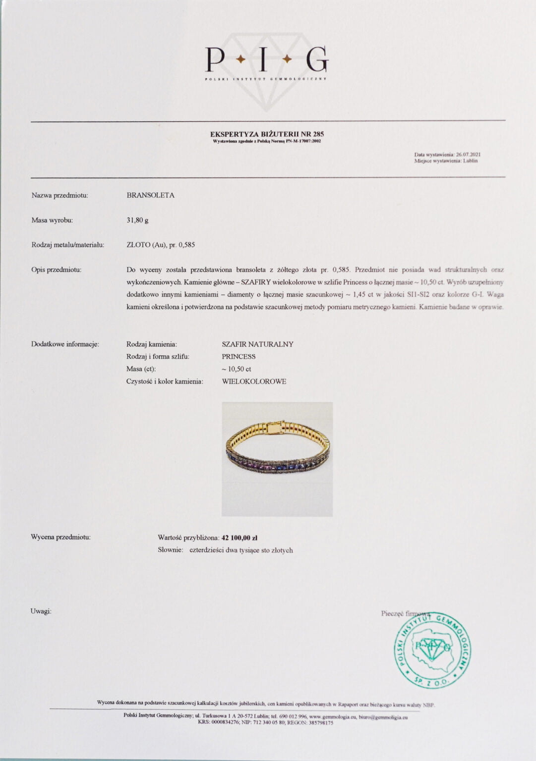 Złota bransoleta z szafirami ( 10,50 ct) oraz diamentami (1,45 ct)